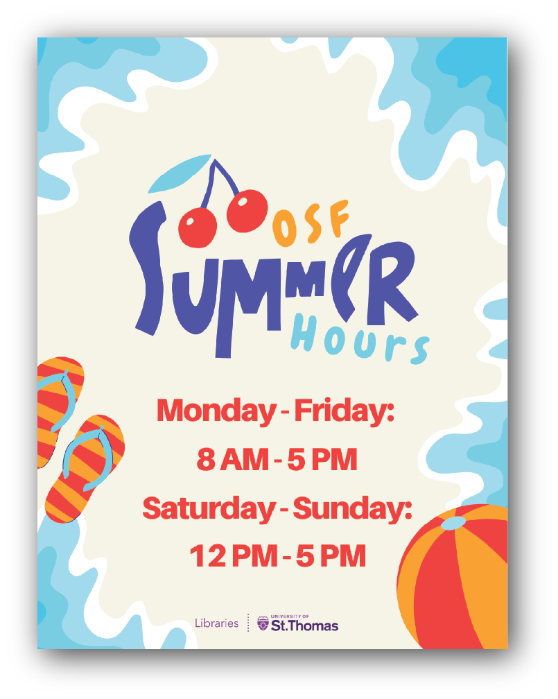This is another marketing flyer I made at my job. This was for the summer of 2025 hours at the main library on campus at St. Thomas, and was posted on the front doors for the duration of the summer. This was made using Canva.