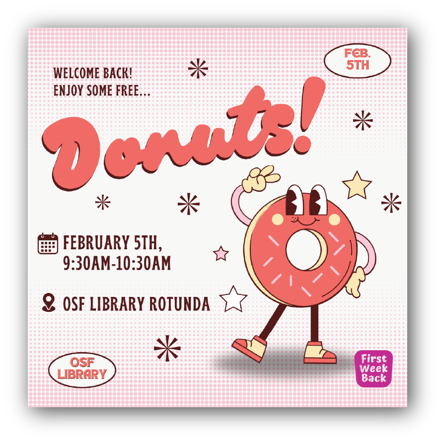 I made this Instagram post for our St. Thomas Libraries page in 2025. There was free donuts at the library to celebrate the first week back of classes. I had to include some branding of the first week back logo in the bottom right. This was posted on our Instagram to invite and inform students of the event.