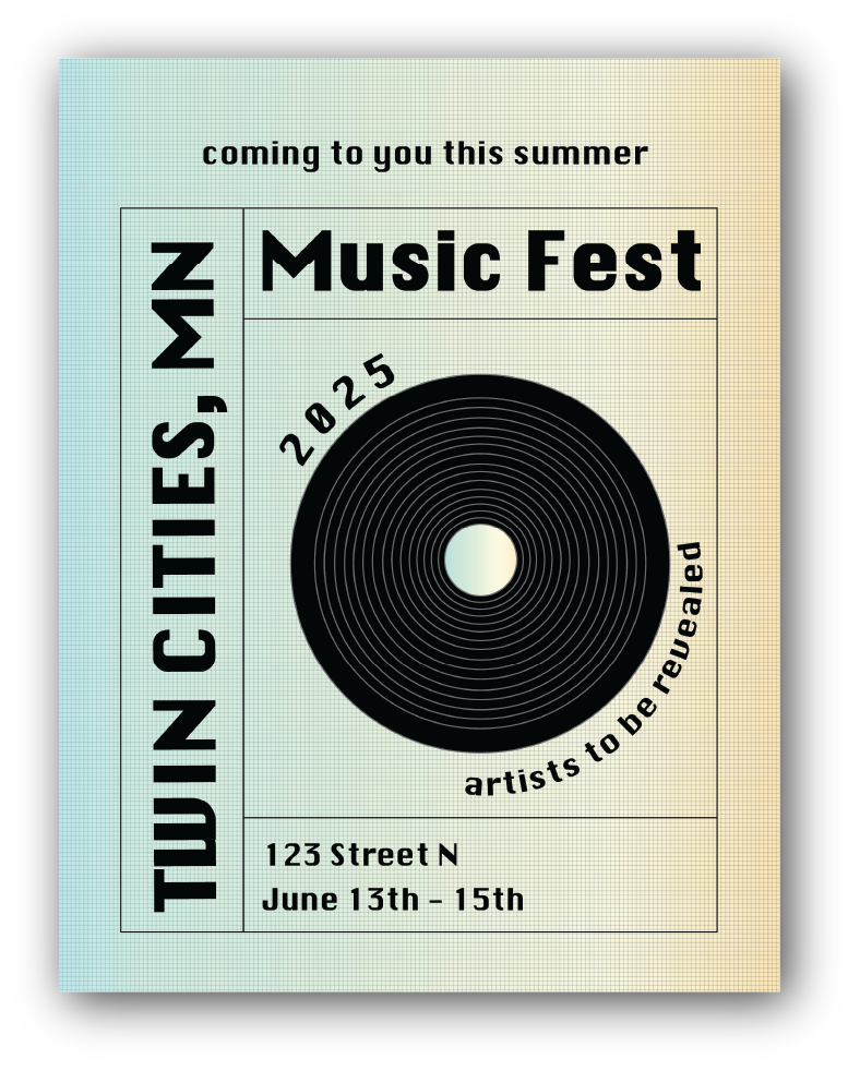 This was a mock poster I made for a hypothetical music festival in the Twin Cities. I had this idea because I saw a few visually pleasing music festival posters on Pinterest, but also because I think St.Paul/Minneapolis should have more live music festivals.