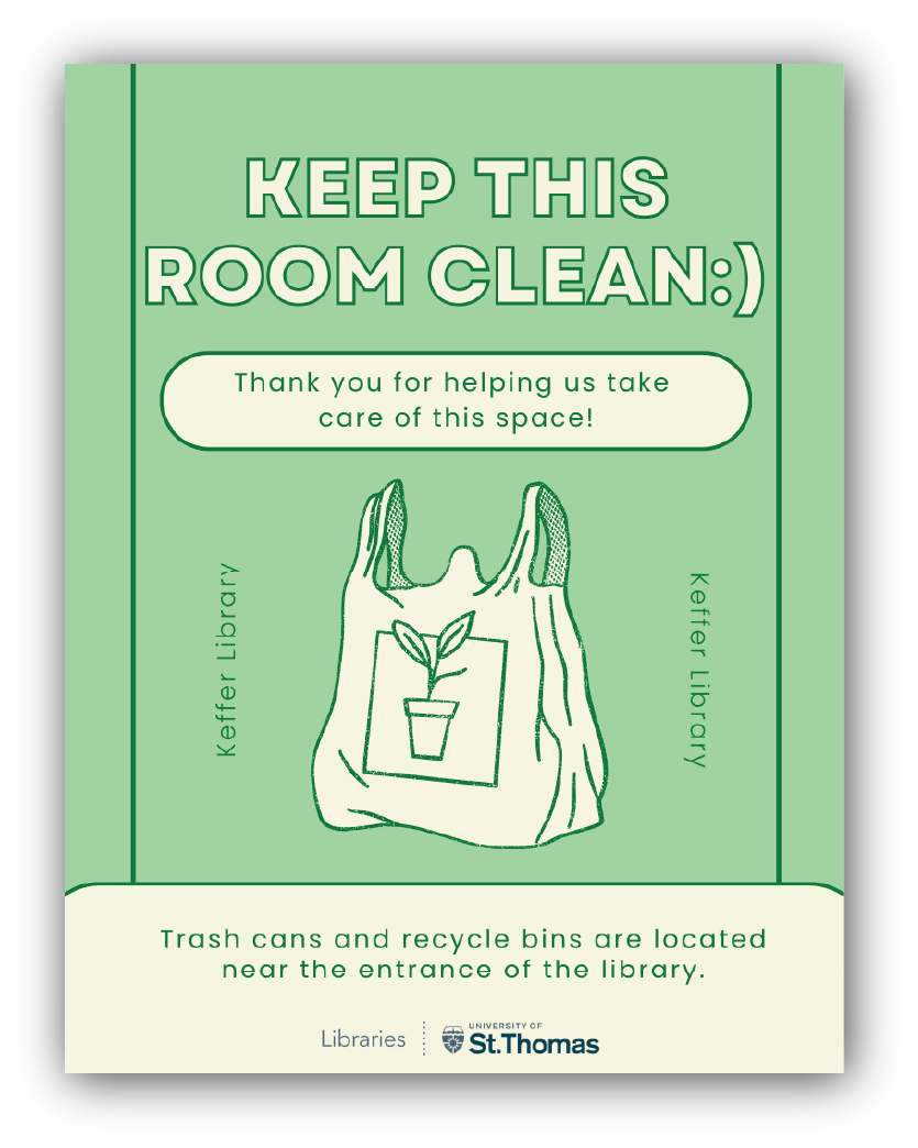 This flyer was made for work at my student intern job at the Libraries for the Keffer Library in Minneapolis. This was made for the study rooms on campus reminding students to clean up after themselves. The trash cans were located outside the study room and this often led students to leave it a mess. I made this flyer to direct them to where the trash cans and recycle bins were so this problem could be solved.